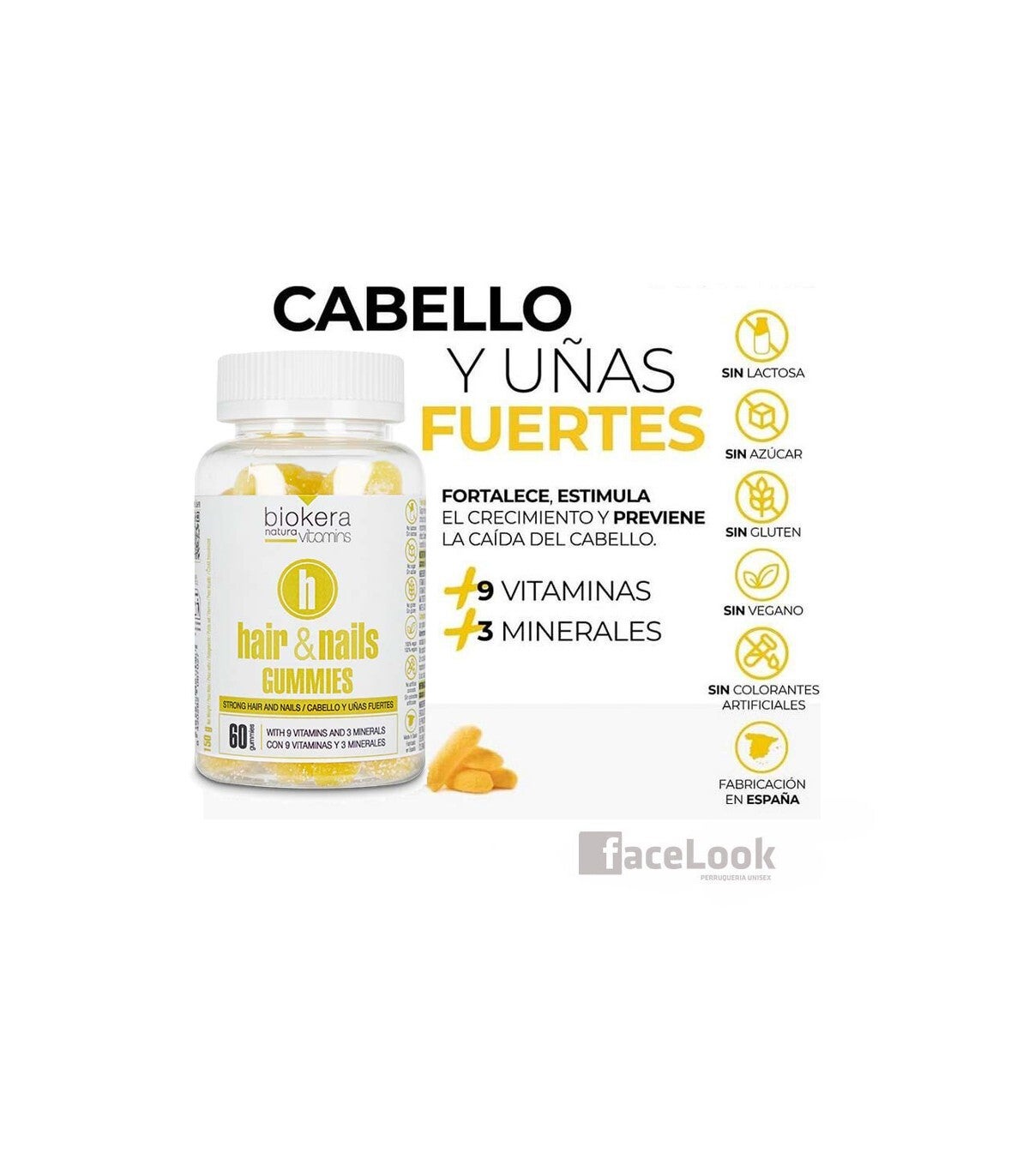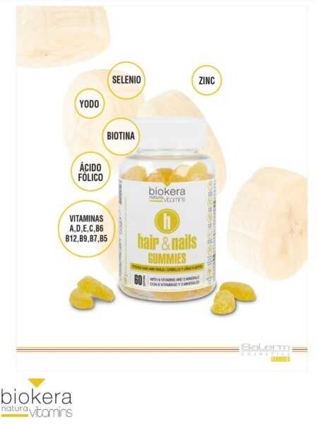 Cabello y uñas fuertes con nueve vitaminas y tres minerales. Sabor plátano.Complemento alimentario a base de vitaminas y minerales con edulcorantes para reforzar la salud del cabello y uñas. Uso tomar tres gominolas en cualquier momento del día. Tratamiento recomendado durante un tiempo de tres meses, obteniendo los mejores resultados a los seis meses. Los resultados pueden variar de una persona otra.